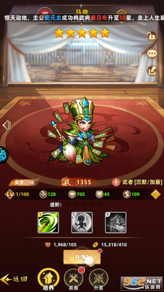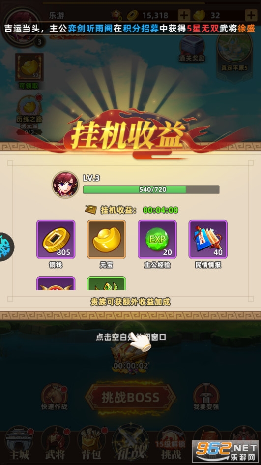 10s自动推图,挂机也升级,通关超轻松。更有任务扫荡,一键完成日常,摆脱繁琐任务的疲惫感,不打工不熬夜,轻松享受游戏的快乐。 恭迎各位主公一同开启恢弘乱世史诗的新篇章!