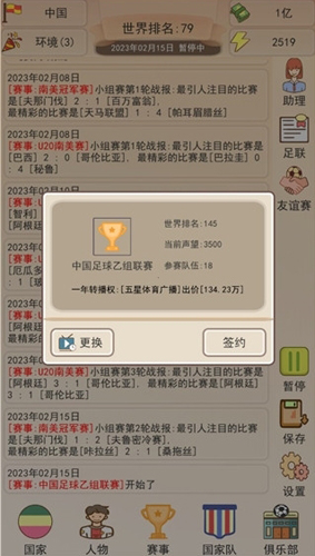 不同于传统足球竞技类游戏,《足协模拟器修改版》聚焦于宏观管理与长期发展。你将统筹国家队建设、联赛运营、青训体系乃至商业合作,每一步决策都影响着中国足球的未来走向。通过签约赞助商获取资金、提升国家足球环境、培养高潜力球员,逐步扩大影响力,最终目标直指世界杯舞台。