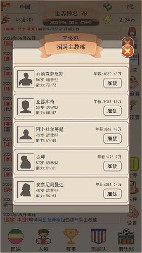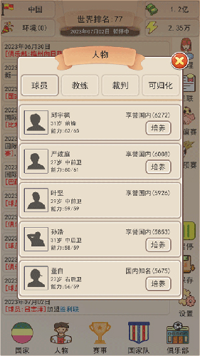 想让球员快速变强?关键在于国家基础建设。进入【国家】菜单,执行提升球员水平”操作,不仅能提高新招募球员的初始能力,还能同步增加国家声望,为后续发展奠定坚实基础。记住:环境决定上限,属性决定下限,二者缺一不可。