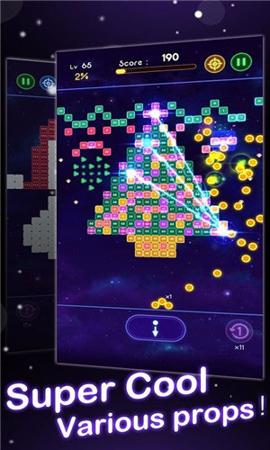 游戏内置海量关卡,方块组合千变万化,绝不重复。同时设有奖励系统,完成挑战即可获得丰厚资源,用于在商城中兑换强力道具,如多球发射、穿透弹、减速等,助你轻松应对高难度关卡。这些道具不仅实用,还能显著提升通关效率与游戏乐趣。