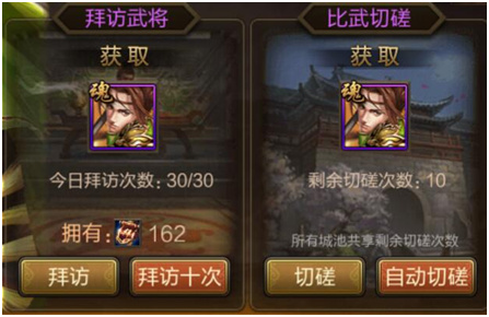 武将获取渠道: - 酒馆招募:稳定获取各类品质武将; - 拜访+比武:互动玩法赢取稀有将魂; - 限时神将活动:锁定高人气名将,不容错过。
