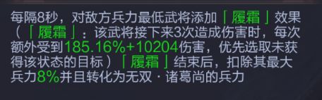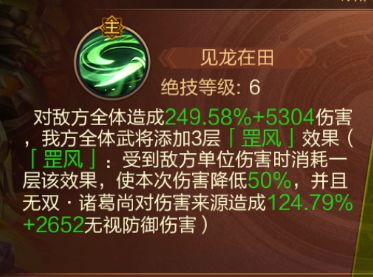 主动技能「见龙在田」:对敌方全体造成伤害,并附加罡风”效果,降低己方武将后续3次所受伤害,同时对伤害来源造成无视防御的反击。