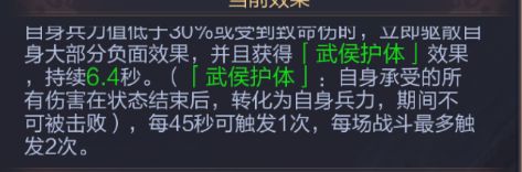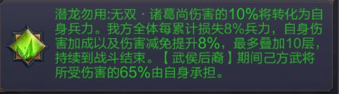 被动技能体系: - 「刚勇」:受击时30%概率发动必中反击,附带清除敌方增益与自身回血效果; - 「鱼跃于渊」:全队普攻累计12次后触发必中伤害并削减敌方战意; - 「屡霜冰至」:标记残血目标,使其反伤并为自身回血; - 「武侯后裔」:7.5秒不死状态,结束后将承受伤害转化为兵力,极致保命; - 「潜龙勿用」(天赋):配合武侯后裔”可承担全队65%伤害,并触发全队愈战愈强机制。