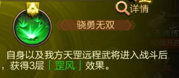 星象技「骁勇无双」:开场为我方远程武将叠加3层罡风”,显著提升脆皮后排生存能力,避免被秒杀。