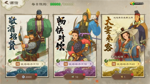 酒馆——封地中的社交中心,茶香四溢、豪杰云集。玩家可通过酒馆获取武将碎片,招募心仪名将加入麾下。