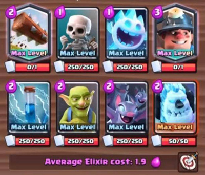 本套卡组平均圣水消耗仅1.9,主打高速过牌与矿工偷塔战术。核心思路是利用大量低费卡快速循环,频繁刷出掘地矿工,直接钻入敌方塔下造成持续伤害,迫使对手疲于防守。辅助卡如戈仑冰人、冰雪精灵与小闪电可用于开局消耗塔血;滚木则侧重防守,清理地面人海单位。实战中需注意拉扯走位,避免低生命单位被秒杀,同时把握小哥布林、小蝙蝠等卡牌的输出窗口,实现高效骚扰与反打。