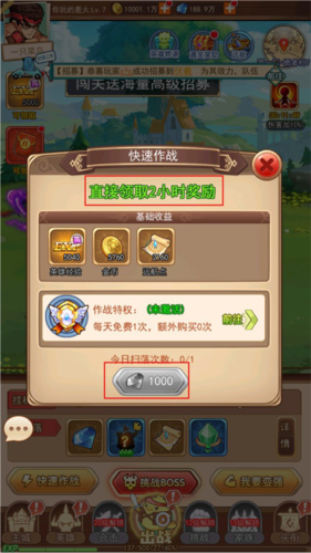 快速作战:直接领取指定时长的挂机奖励,每日基础1次,开通作战特权后次数大幅增加,效率翻倍。
