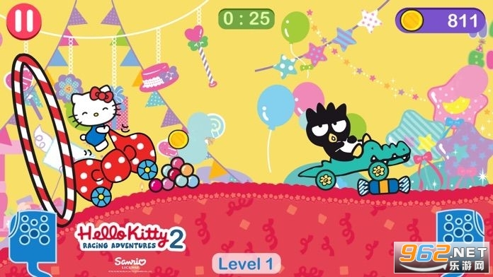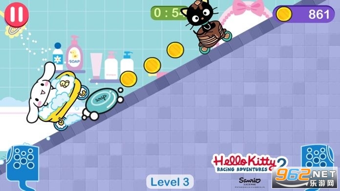 3.玩家将操控凯蒂猫,在各种环境的赛道上进行跑酷,赛道上有着许多的金币和道具。