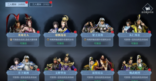 作为手游独创的核心战斗机制,武将羁绊基于历史人物关系设计。由2-3名有剧情关联的武将组成组合,可激活属性加成;部分特殊组合还能释放强力合击技能。战斗中,主将与副将在攻击或释放无双技时积累合击值,集满后即可手动触发羁绊大招,扭转战局。