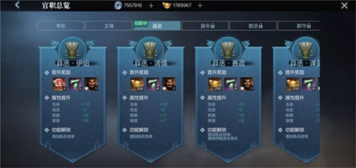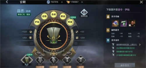 晋升条件涵盖主线进度、主公等级、百花挑战层数及武将星级,需全面发展。每晋升一级,不仅获得生命、攻击、防御、穿透等属性奖励,还能强化属地增益效果。特别值得注意的是——官职达到亭长”后,将开启自动化收益系统,即使挂机或下线,也能持续获取元宝俸禄、经验与税务收入,加速发育节奏。因此,前期务必优先推进主线,快速提升官职,抢占成长先机。
