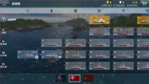面对庞杂的舰船研发路径,科技树系统为你提供清晰的发展蓝图。通过可视化界面,可直观查看各舰种解锁条件、所需经验、属性变化及分支路线。