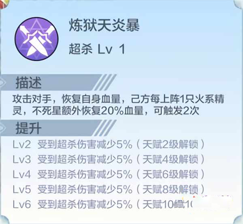 【超杀技能·炼狱天炎暴】:攻击时恢复自身血量;若队伍中存在其他火系精灵,额外恢复20%生命,最多触发2次。该技能在火队中收益显著,可有效延长站场时间。