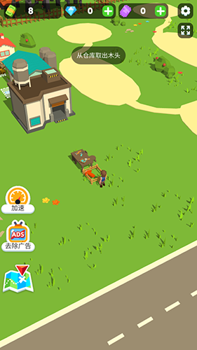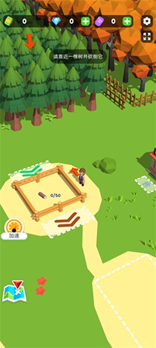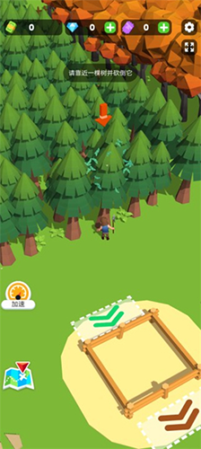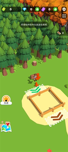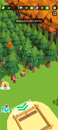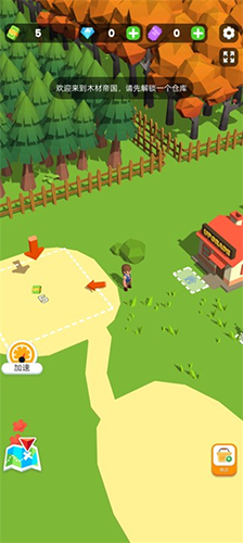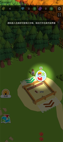 进入游戏后,先移动角色点击界面中的钞票图标,画出5个钞票即可解锁初始仓库。随后前往树林区域,角色会自动开始砍树。砍伐完成后,将木材搬运至仓库储存。