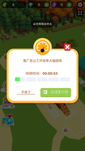 当金币积累足够时,进入仓库升级界面,提升存储容量;同时可花费金币增加工人数量,实现多人同步伐木,效率翻倍。