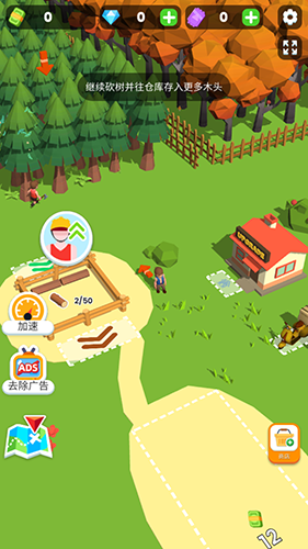 进入游戏后,按住屏幕即可控制角色移动,靠近树木自动砍伐。初期优先建造木材仓库和剥皮机,将原木加工为高价值成品出售。资金充裕后,点击招募按钮雇佣工人协助伐木,并持续升级其工作效率。记得定期查看每日任务,完成可获得丰厚奖励,加速你的扩张进程。