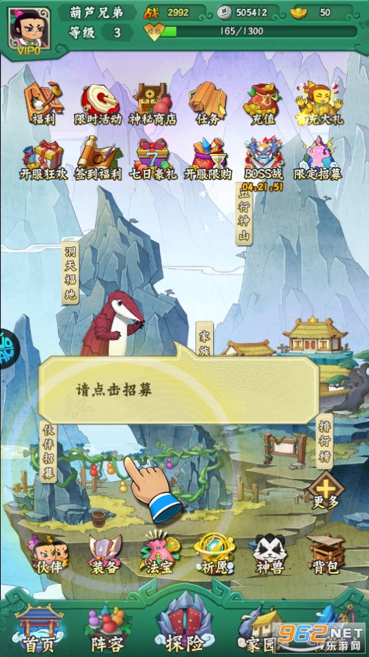 降妖之路虽困难重重,但总有好运相伴左右,二娃千里眼拨开仙境迷雾,带你巧遇降妖伙伴,登顶云端获取秘宝!