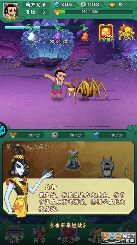 《葫芦兄弟七子降妖0.1折》是一款以86年的那版《葫芦兄弟》为蓝本打造的冒险战斗游戏,经典复古式的画面,精彩的故事剧情,游戏的还原度极高,玩法融合了包括挂机挑战等多种元素,在游戏中,玩家将收集和培养各种葫芦娃角色,通过布阵、技能搭配等策略来挑战各种妖精。每个葫芦娃都有自己独特的技能和属性,玩家需要根据敌人的特点来合理搭配,以发挥出最强的战斗力。通过收集和培养各种葫芦娃角色,与其他玩家一起争夺最强葫芦娃的荣誉。兄弟们一起并肩作战对抗妖怪救出爷爷吧!