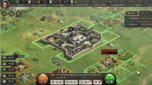 迁城 通过政厅-主公-迁城”功能,可将主城或分城迁移至新地点。需先攻占目标区域相邻11格土地(中心地块等级≥6),并在中心筑城,消耗500金铢后由谋臣提供建议,确认后完成迁移。注意:建筑不得处于建设中、部队须全部回城、主公不得被俘,且迁城后有72小时冷却时间。
