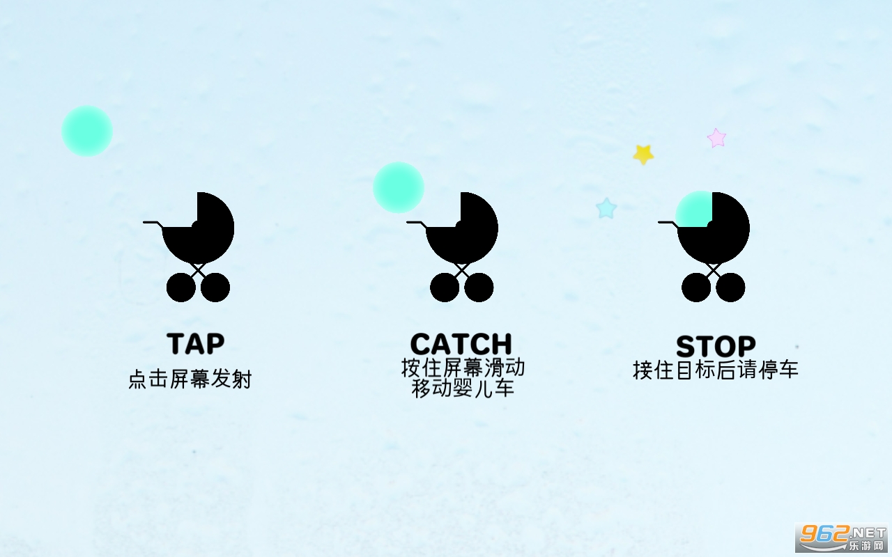 1.滑动屏幕移动婴儿车,接住目标即可过关!