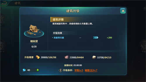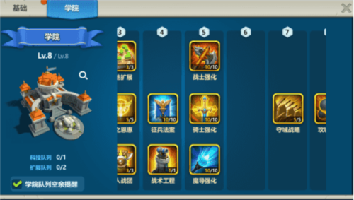 建议集中资源培养单一主力军阵,优先升级精锐营(提升英雄带兵上限)。路径推荐:7级城堡 → 3级学院 → 3级精锐营。同步多占4级地提升资源与经验,配合补刀战术,稳步拿下5级地,顺利迈入全新发展阶段。