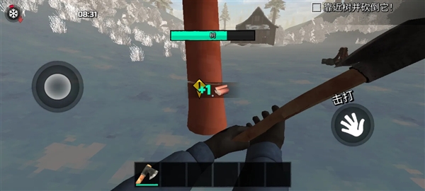 装备斧头后,靠近树木即可进行砍伐作业,木材是生火、建造和制作的基础资源。