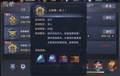 大秘境(85级开放):循环挑战模式,挂机即可获取强化石、神器碎片等紧缺资源。