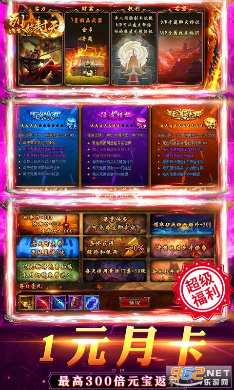 《烈焰封天》是一款独创1秒百级,刀刀斩杀,创号三角色,真百倍爆率的全新传奇类手游。最强开局福利,1秒百级,1元超低月卡,海量元宝返利,档档超劲爆福利,赢在起跑线!打不尽的BOSS,爆不停的元宝,千人同屏攻沙,跨服自由PK,最激爽传奇,邀你来战!