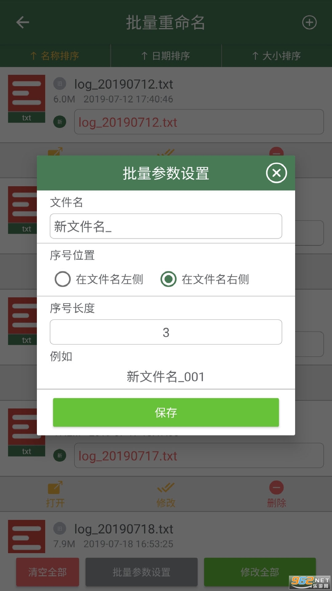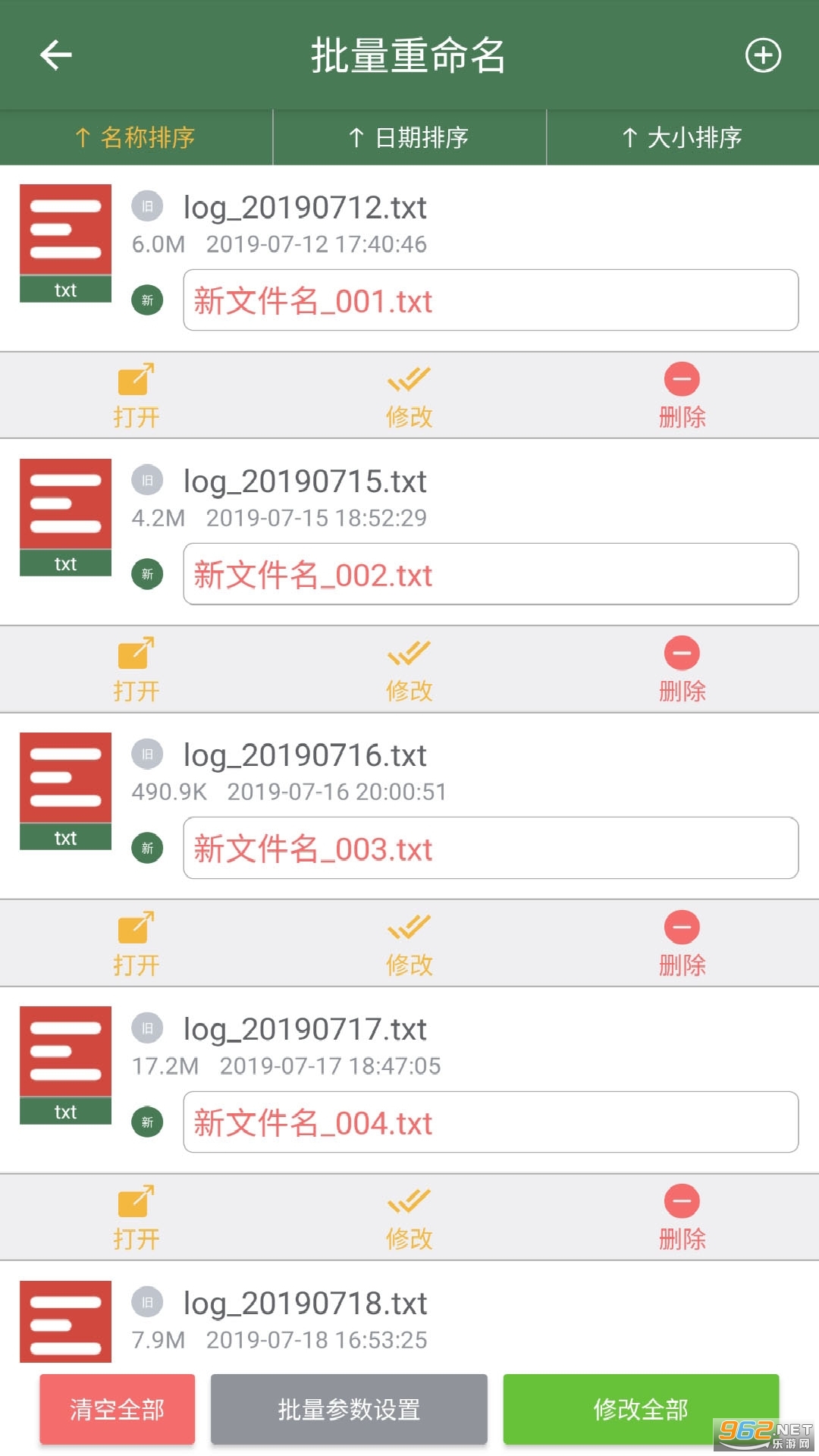 批量重命名助手是一款能够批量修改文件名的小工具APP,这个APP能够满足您文件重命名上面的所有需要,将您中无聊、重复、耗时的机械动作中解放出来,告别一个一个的对文件进行改名,批量模式下,至少节省您80%的时间!且功能丰富,功能包含有:批量重命名文件、文件名批量加前缀、文件名批量加后缀、批量改文件扩展名、批量转换文件名大小写等,能够对需要重命名的文件进行排序,支持按照文件名称排序、文件大小排序、文件最后修改时间排序、以及自定义拖拽排序等,所有操作一键完成,简单快捷。