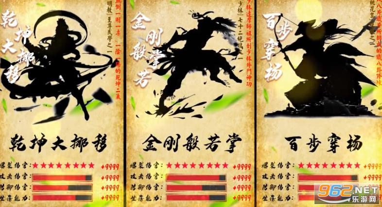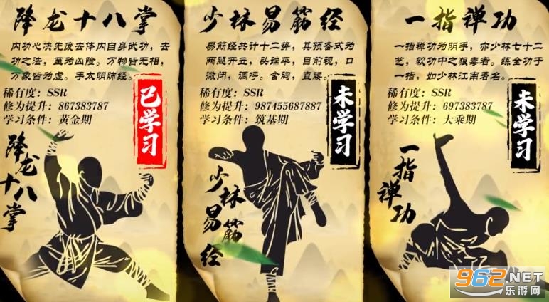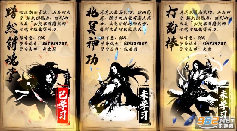 1、简单的卡通和文字打造的武侠休闲游戏,游戏之中加入了很多网文之中的武林秘籍元素;