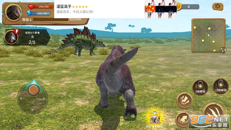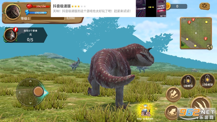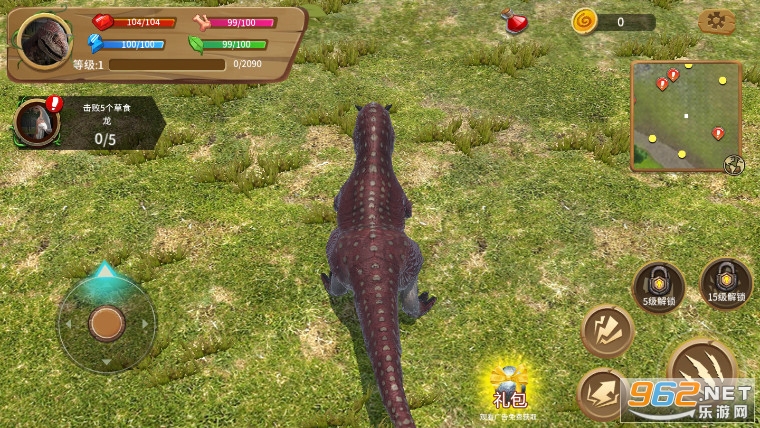 恐龙世界模拟器是一款模拟恐龙的3d动作类手机游戏,在游戏中,玩家将成为一头恐龙,通过不断的不是来获得食物,这样可以让自己快速成长,而你可以看到恐龙的健康状况、食物、水、体力等情况,正确的控制恐龙进行捕猎很重要,可以自由控制恐龙奔跑和攻击,丰富的挑战内容等你来战胜,而且通过狩猎可以获得大量的积分,可以用来强化你的恐龙。