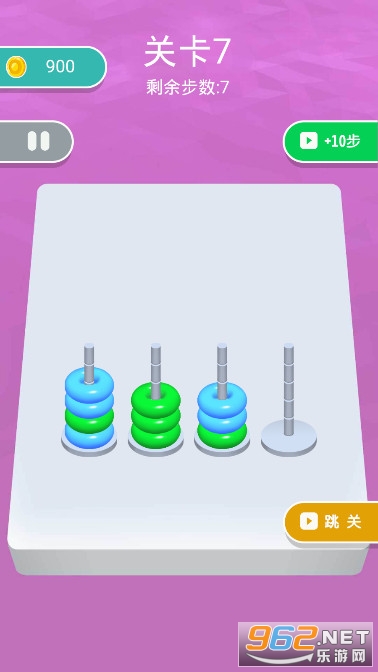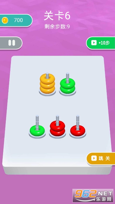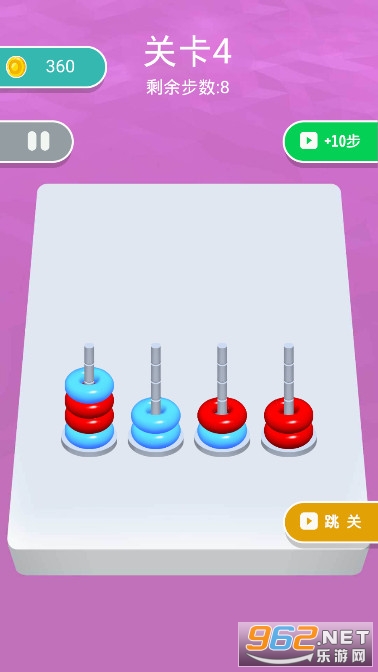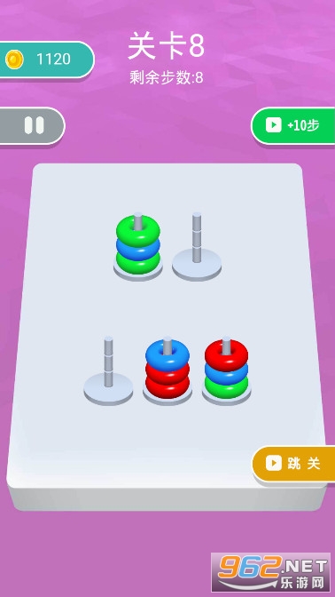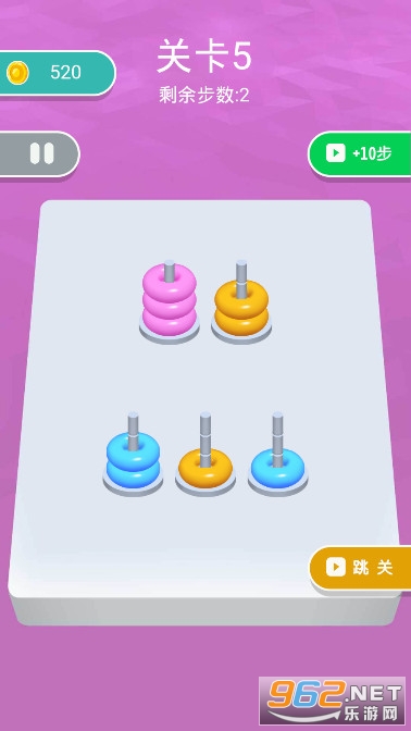 《全民脑洞训练游戏》是一款有趣的休闲解压闯关小游戏,游戏的玩法很简单,这里有很多五颜六色的圆环,它们会被放在不同的铁签子上,你要按照颜色来将它们分类,将相同颜色的圆圈套在同一个签子上,注意你的移动步数是有限制的,不要超过哦。