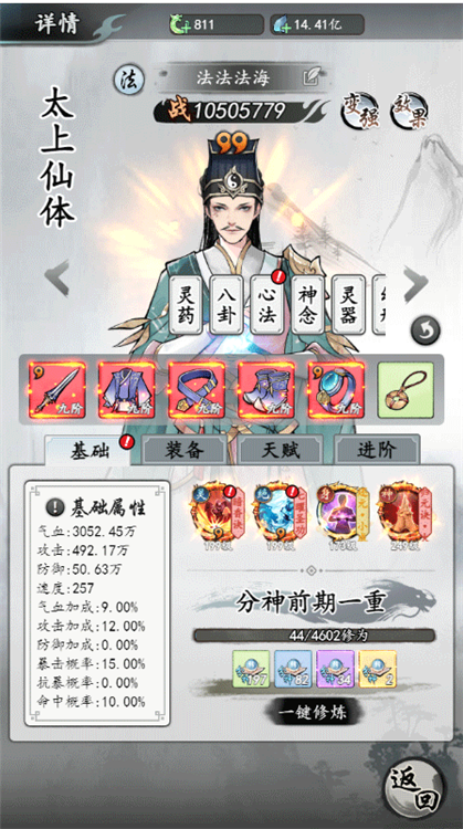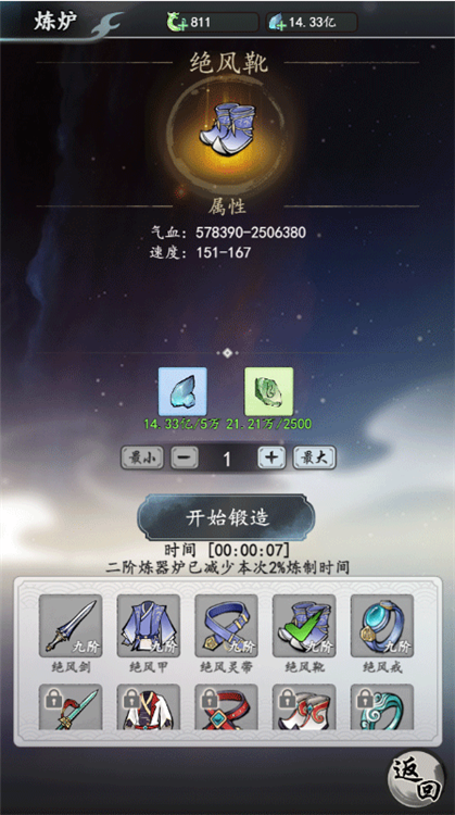 功法分为灵、绝、身、神四类,品质同样按红橙紫蓝绿划分,可通过【藏经阁】查看图鉴。新手期优先使用功法残页升级核心技能,如法师推荐化生诀”+连击属性神通,医师则必备辰月仙诀”(俗称无敌盾)。装备主要通过【炼炉-炼器】锻造获取,鞋子优先选加闪避,戒指优选带原地复活”词条,后期可全员佩戴。每次仙众突破大境界后,务必及时锻造更高阶装备。