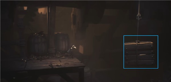 向上攀爬至高台,向右移动,再次用弓箭击落悬空箱子,随后跳下。