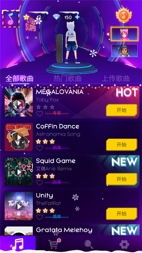 完成关卡后,你将获得丰厚奖励,用于解锁新内容或提升游戏体验。返回主界面后,可自由选择全部歌曲”热门歌曲”或上传歌曲”三大分类,随心挑选心仪曲目开启新一轮挑战。