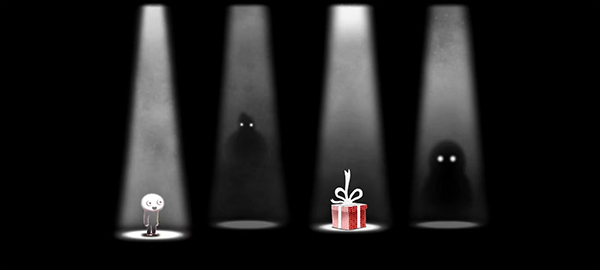 2、梦境初始一片漆黑,仅有一束聚光灯照亮主角。你需要操控小男孩在黑暗中摸索前行,不久后会发现一个礼物盒。