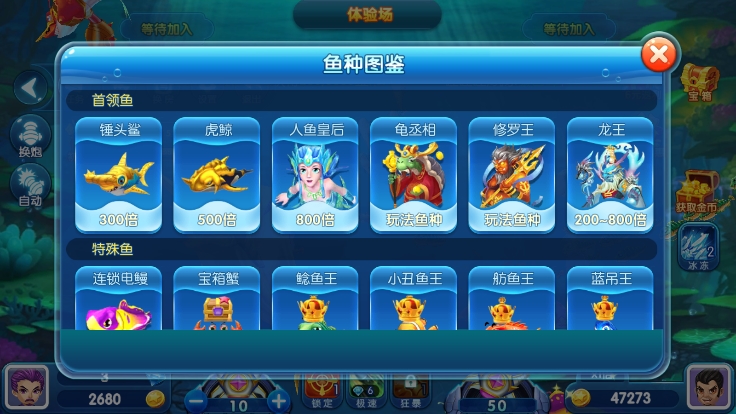 想了解每种鱼的特性与捕获效果?只需在捕鱼界面点击左侧箭头,选择鱼类”选项,即可进入完整图鉴页面。在这里,你能清晰查看所有鱼类信息,包括特殊鱼种的奖励机制与触发条件,助你精准制定捕捞策略。