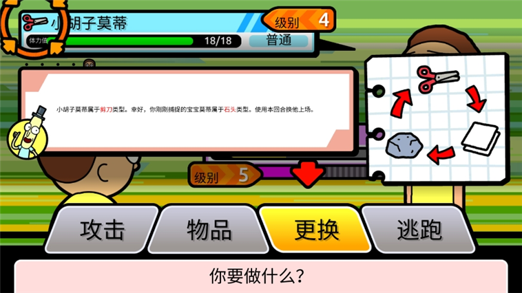 进入游戏后可跳过对话,系统将引导你完成基础教程。注意:莫蒂的体力值归零会陷入晕厥状态,无法继续战斗,需合理规划行动。击败对手莫蒂后可获得莫元”,用于后续升级或购买道具。游戏采用双按钮操作:左侧控制角色在场景中上下左右移动,右侧用于互动或拾取物品。当遭遇野生莫蒂时,靠近后点击右侧A键即可触发战斗。战斗中削弱其血量后,使用莫蒂操纵者芯片”可尝试捕捉,成功后该莫蒂将加入你的队伍。由于莫蒂分为剪刀、石头、布三种属性,面对不同敌人时需及时更换上场角色以发挥属性克制优势——例如石头型莫蒂对剪刀型敌人伤害显著提升。每次胜利后均可获得奖励,持续探索将解锁更多维度与剧情内容。