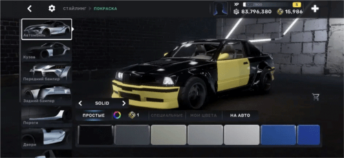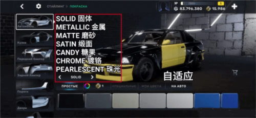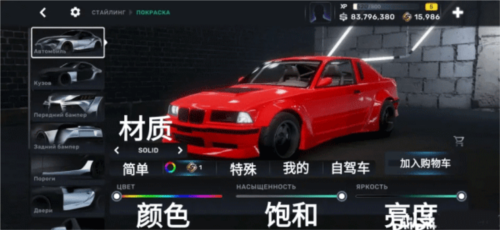 外观改装分为套件与喷涂两大模块。套件涵盖引擎盖、前后裙、侧裙、尾翼、轮毂等数十个部位,轮毂类型包括原厂(Stock)、速度型(BS)、漂移专用(ZeroDrift)和轻量化(DSpec)。喷涂系统支持全车分区域上色,提供多种材质与色彩组合,并具备智能配色推荐功能,助你轻松设计出炫酷涂装。