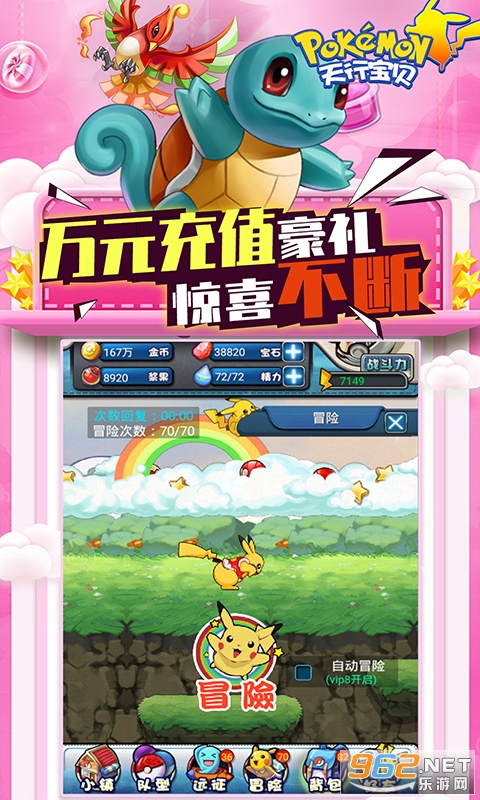 《天行宝贝-送万元充值》手游是一款Q版风格的冒险类手游,游戏中以经典的神奇宝贝为背景,让玩家在神奇大陆进行享受战斗的乐趣哦,和记忆中最经典的宝贝一起去战斗哦!