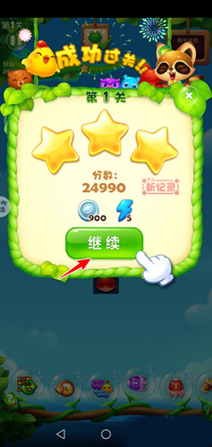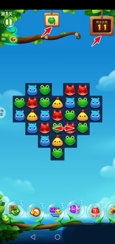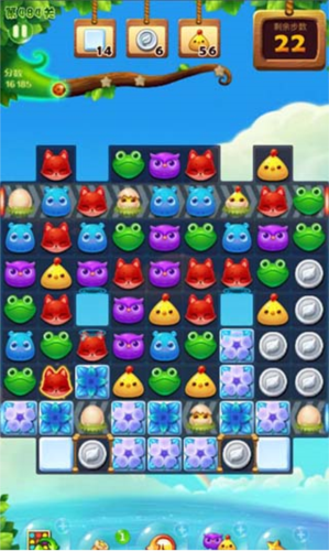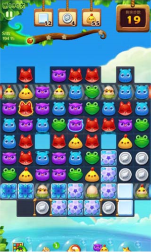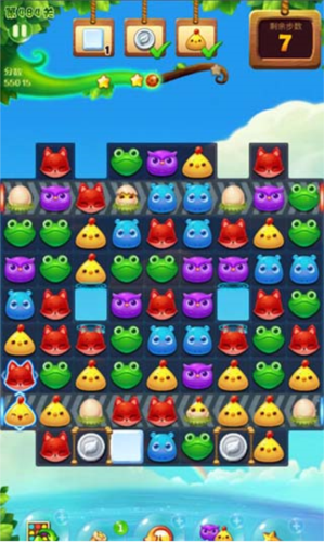 进入关卡后,界面顶部会显示当前任务目标(如消除10只青蛙”),右上角显示可用步数。通过交换相邻动物位置形成三连即可消除,上方动物会自动下落填补空缺,若自然形成新连线,系统将自动连续消除。完成任务后自动结算奖励并展示通关分数,点击继续”即可挑战下一关。