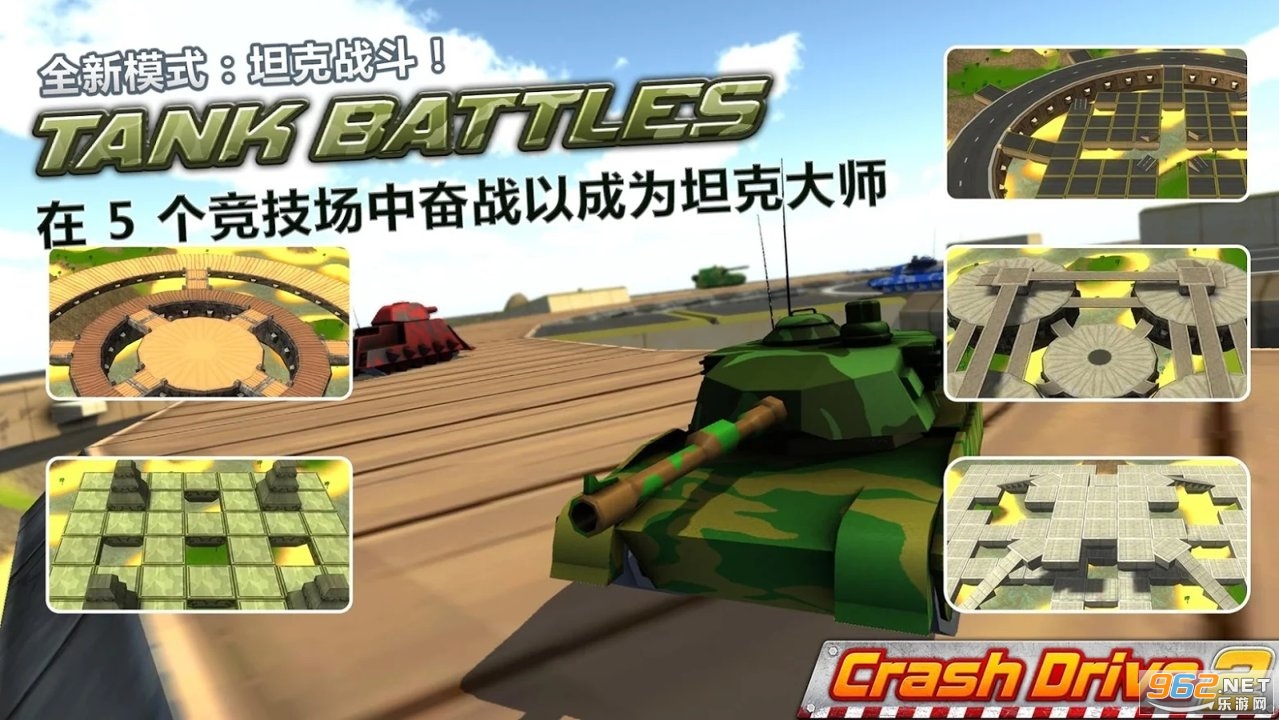 《撞车驱动器2》(Crash Drive 2)是一款3d卡通风格的专车竞技游戏,游戏中加入全新的坦克和卡车来进行战斗,游戏中有着非常多不同的地图等待你的选择,还有着多种不同的模式和玩法等待你的选择,驾驶你喜欢的载具开始全新的挑战,赶快下载体验吧!