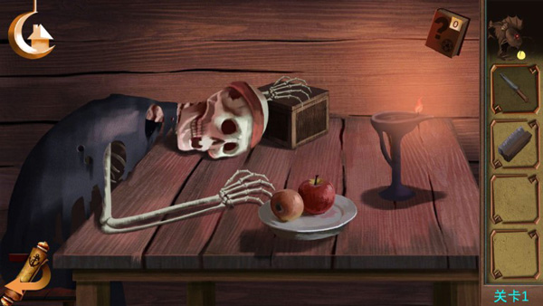【第一章】 点击骷髅获得匕首;点击水桶取得刷子;用匕首割断柱子上的绳子;点击窗户拾取骨头;用刷子清除右墙纸张污渍获取提示;在桌面盒子输入密码V、I、VII”打开获得哨子;吹哨唤醒狗,用骨头引诱它,最终取得钥匙开门逃脱。