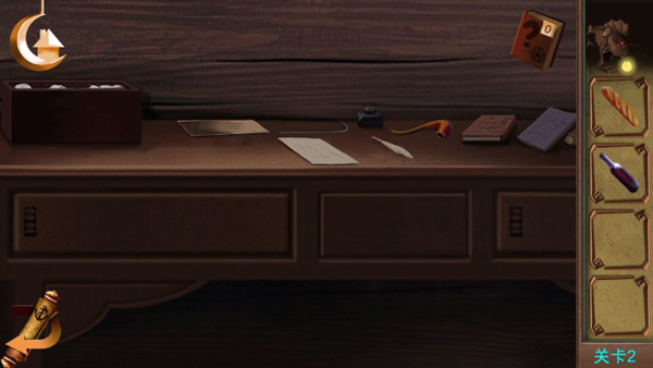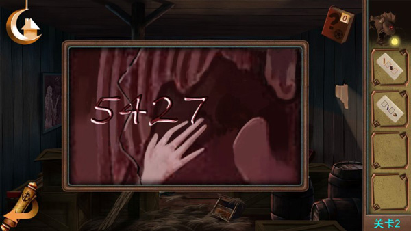 【第二章】 点击左侧箱子获得面包和酒;检查桌子取得纸张提示与撬棍;打开红箱子得咖啡,用撬棍开启木箱获得水果;打开窗户取下钩子上的提示纸;按面包→酒→咖啡→橘子”顺序摆放食物,获得壁画残卷;将残卷放回墙面,获取密码5427”,输入后取得钥匙成功逃脱。
