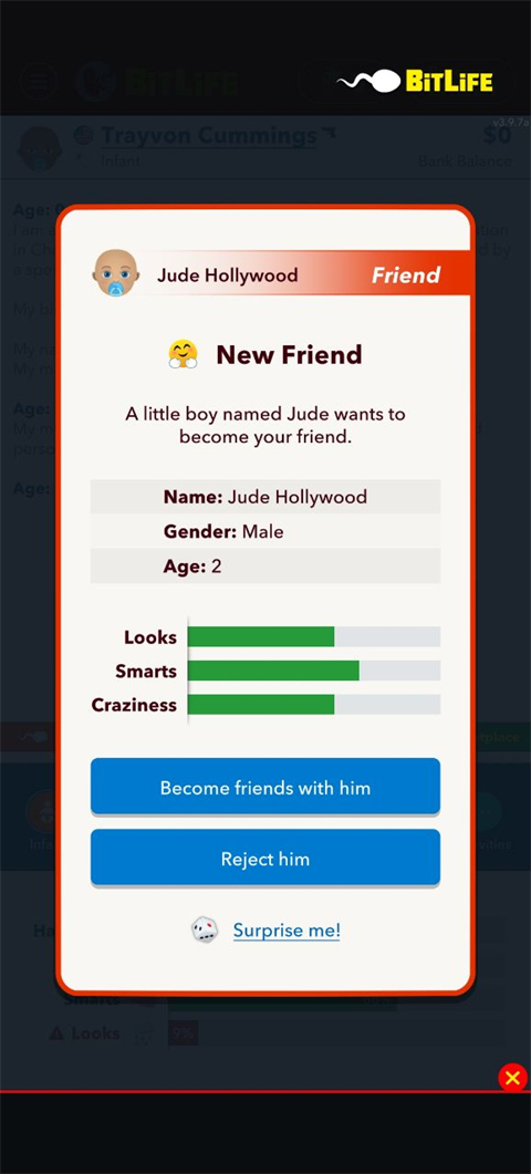 进入游戏后,首先选择角色性别,随后设定初始身份背景。点击绿色+”按钮即可推进年龄,每增长一岁都会触发新事件并影响各项属性(如智力、魅力、健康等)。随着年龄增长,可解锁更多人生选项:上学、打工、恋爱、结婚、置业、创业……你的每一步选择,都在塑造独一无二的人生故事。