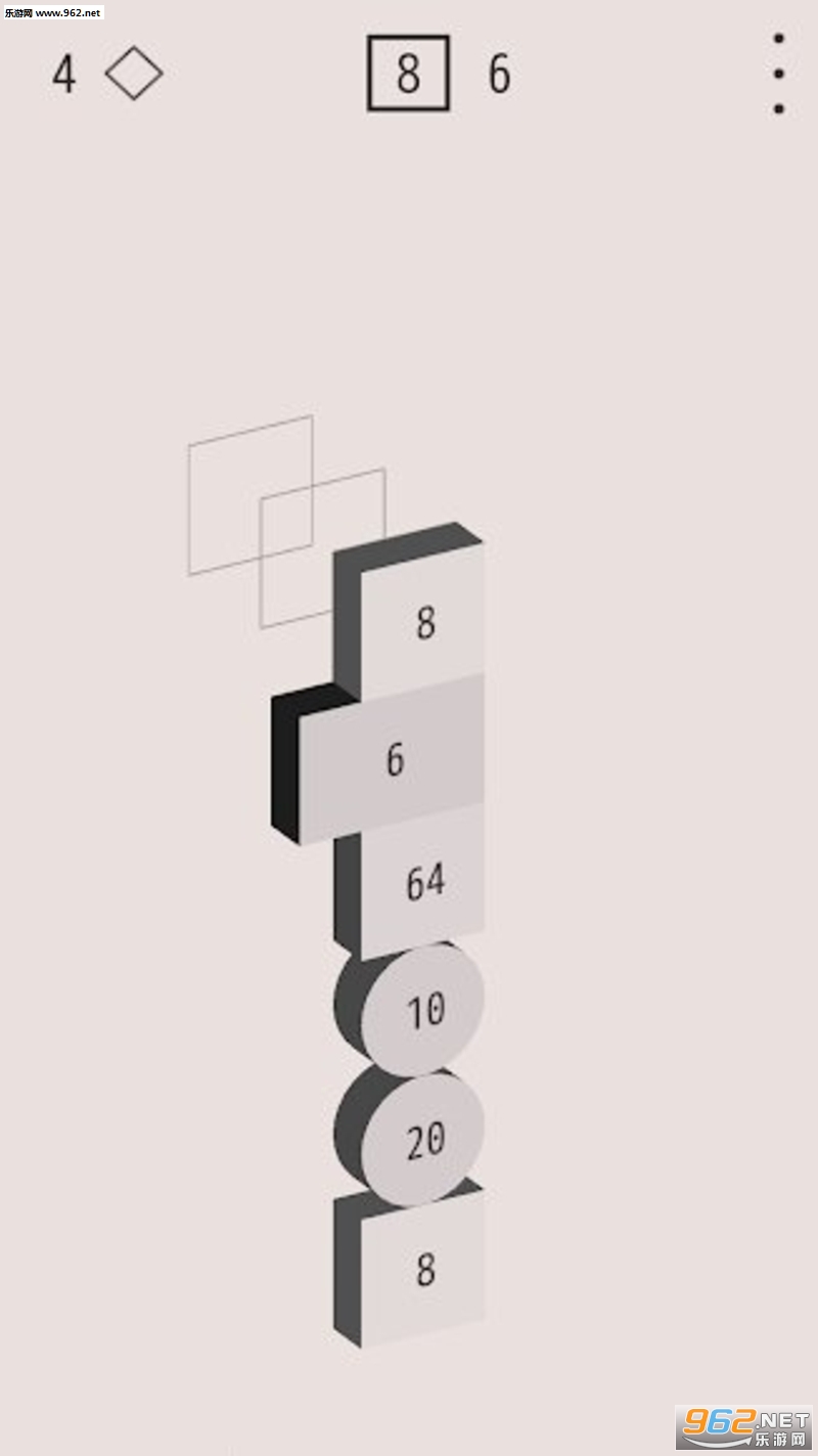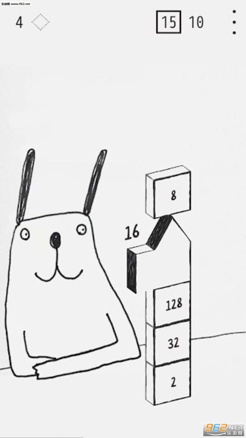 游戏采用竖版排列的方式,玩家双击屏幕会从上向下掉落带有偶数的数字的方块,相同数字的方块会融合在一起会相加成数字的倍数,屏幕最多能放下十个方块,玩家需要在规定的步数内尽量得到更大的数字方块。