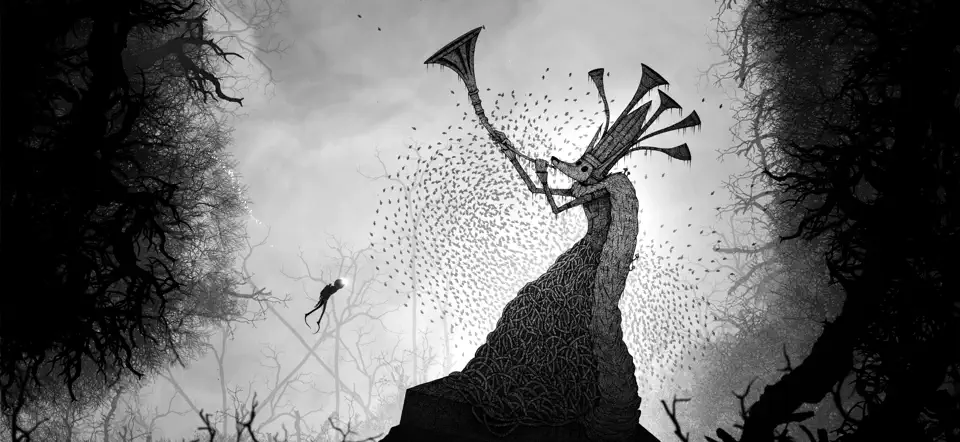 整段旅程如同一场深入地心的痛苦跋涉,黑白交织的画面由艺术家米德亲手绘制,营造出压抑、诡谲又极具艺术感的单色世界。