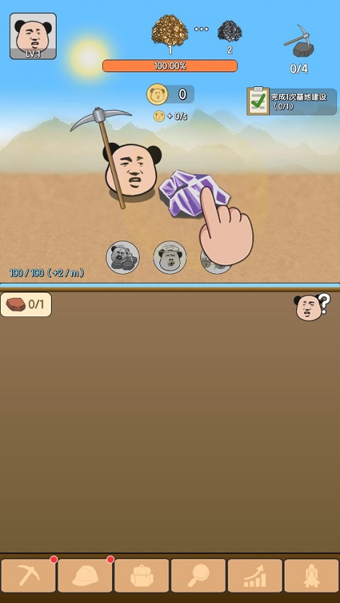 在《熊猫矿工》中,你将扮演一只顶着经典网络表情包大头的熊猫,踏上一条既荒诞又热血的逐梦之路。为了攒够建造火箭的资金,你需要不断点击屏幕挖掘矿石,积累财富。随着攻击力的提升,挖矿效率显著增强;而当手动点击变得疲惫时,还能解锁自动挖矿”死命一击”阳光普照”等强力技能,让收益源源不断。