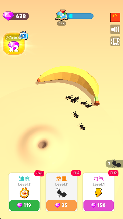 游戏以一只蚁起家,靠搬升级”为核心机制,玩家无需频繁点击或复杂策略,真正实现放着就能玩”。随着进度推进,你可以不断扩充蚁群规模,提升整体效率,让搬运速度呈指数级增长。