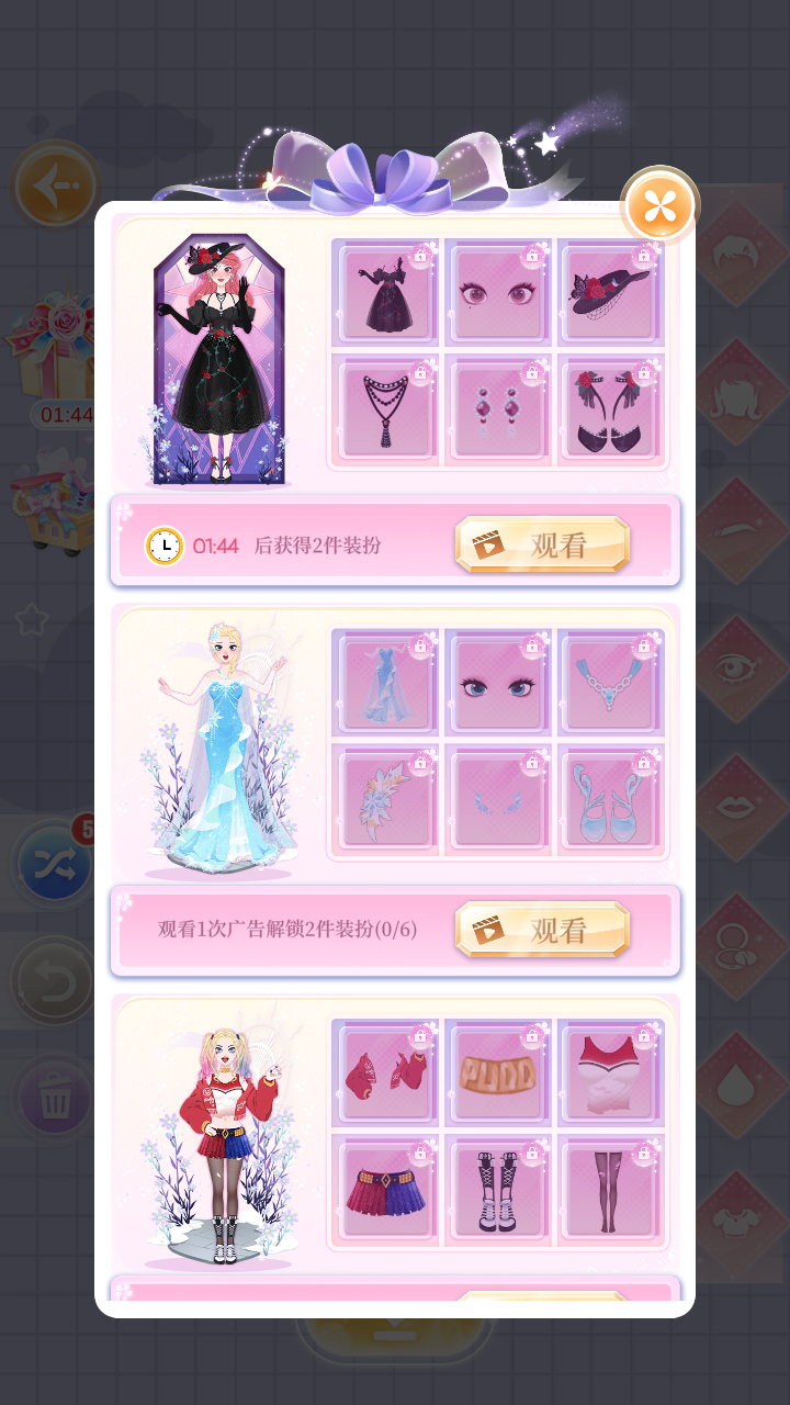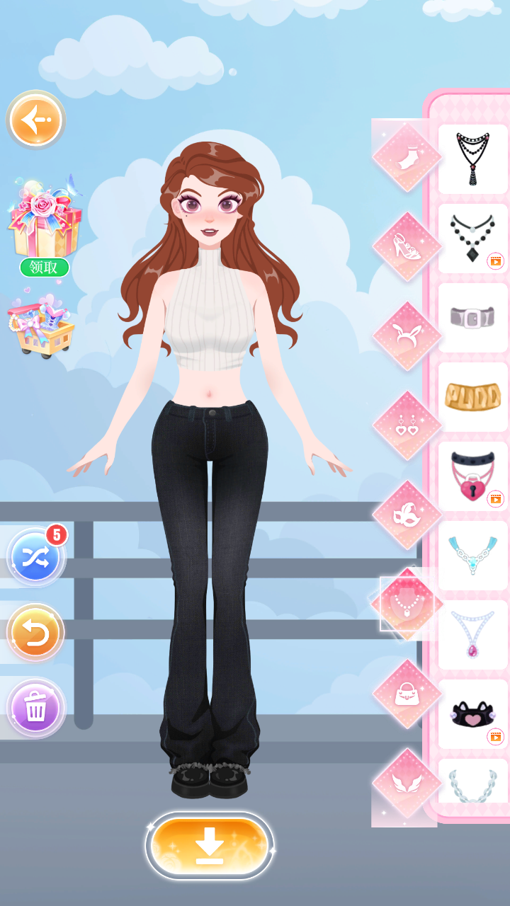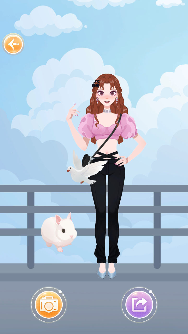在主界面中,你不仅能为角色搭配服饰,还能添加可爱的小宠物、更换背景主题,构建一个充满个人风格的梦幻空间。完成造型后,只需轻点相机按钮,即可将作品截图保存为高清图片,用作手机壁纸、社交头像,或直接分享给好友,展示你的时尚品味与创意成果。