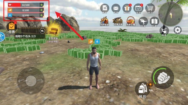 游戏界面左上角实时显示你的三大关键状态:血量、饥饿值与水分。只有维持这些数值在健康水平,才能高效进行探索、战斗与建造等日常活动,生存策略由此展开。